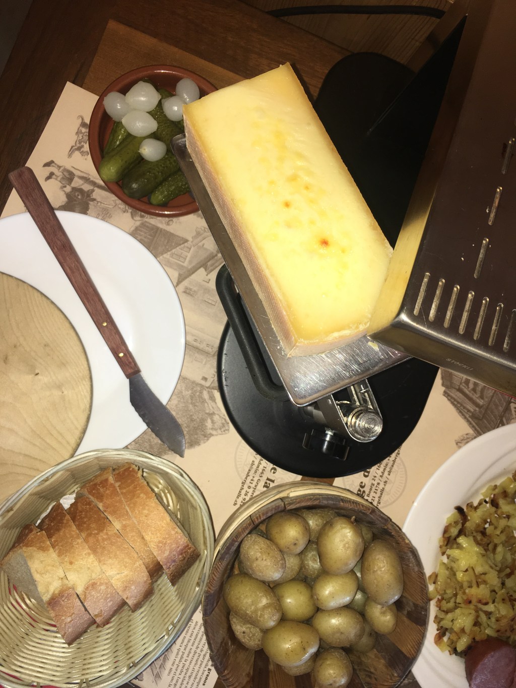 - Raclette – who doesn’t love scraping melty cheese onto food? I first tried raclette at a little hole in the wall in NYC, where they gave you two scrapes of cheese. But that was child’s play. In Switzerland, they give you a whole block of cheese. It’s usually eaten with some mini potatoes, pickled onions, gherkins, dried meat, and/or bread.